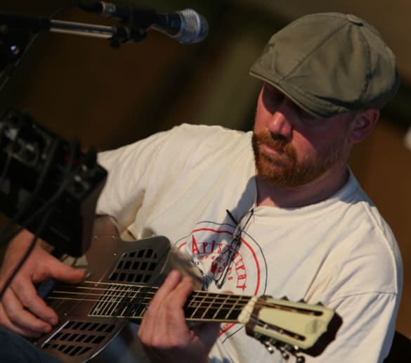 coaxing sounds of the Delta from his steel bodied National guitar, fingerpicking piedmont style rags or flatpicking colorful melodies on a vintage gibson, one can hear every style of Americana he has absorbed along the way. Chris’s guitar