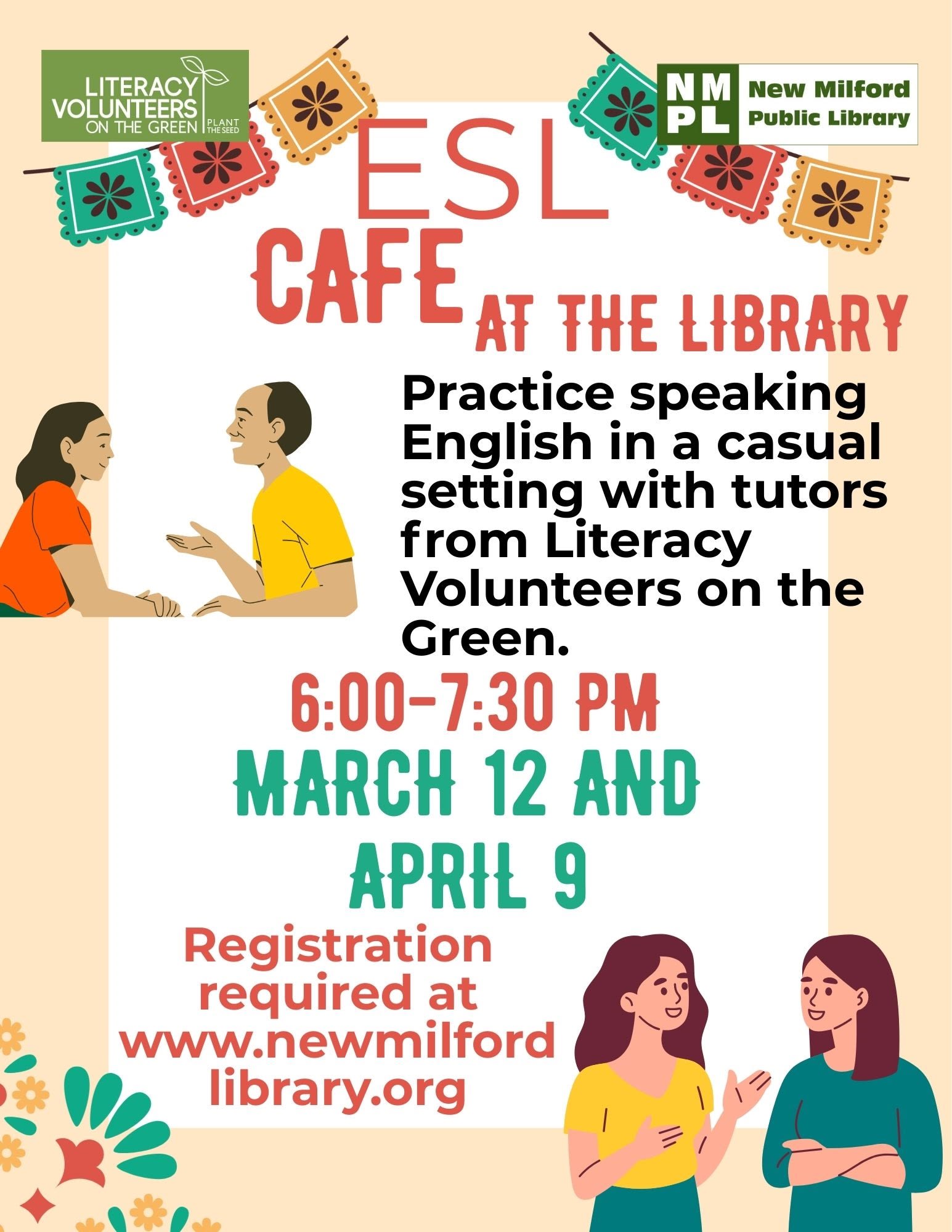 Hello! Practice speaking English in a casual setting at the library. Tutors from Literacy Volunteers on the Green will be on hand to keep the conversation flowing.