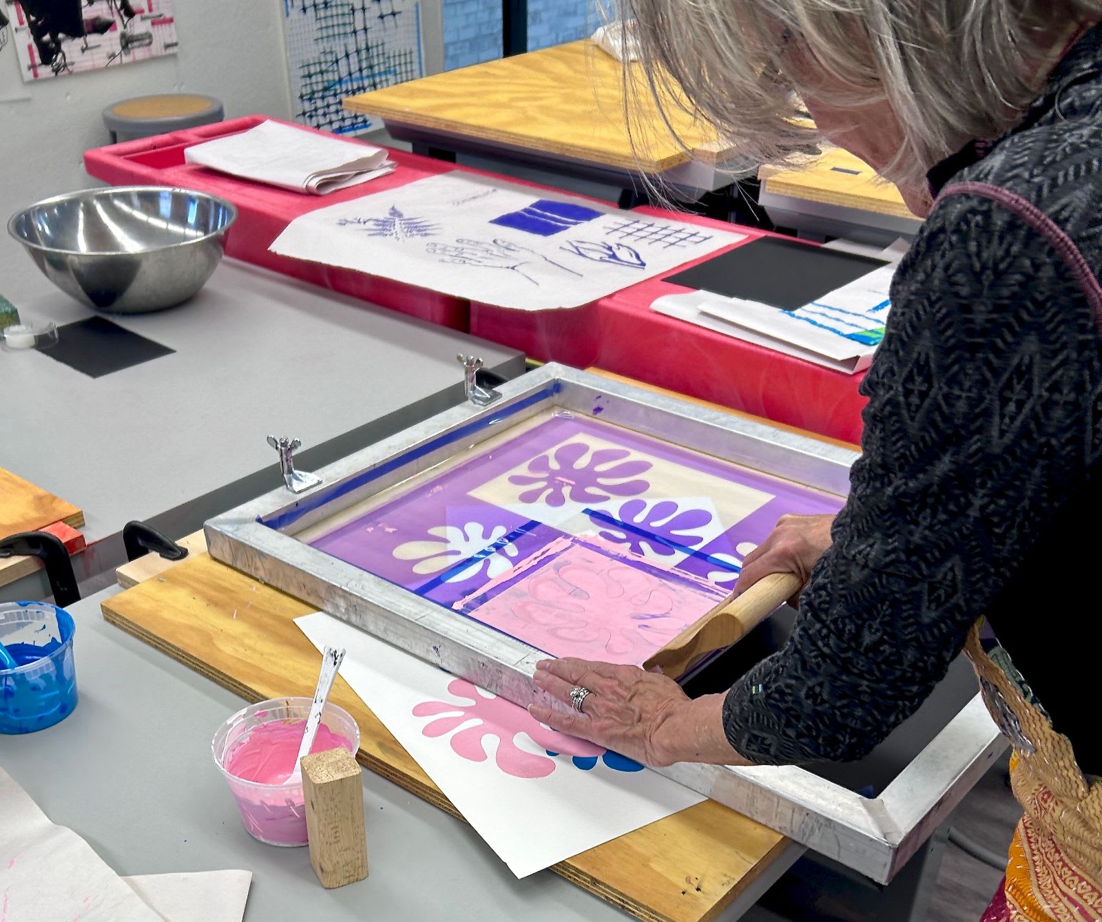 Participants will experiment with analog methods for making screenprinting negatives— including stencil making, ink drawing, drawing fluid, and more—as well as considering play during printing itself, in order to achieve dynamic and layered prints. In this workshop, we will also touch on the full screenprinting process including coating screens, burning negatives, registration, color mixing, washing and reclaiming screens, and more.