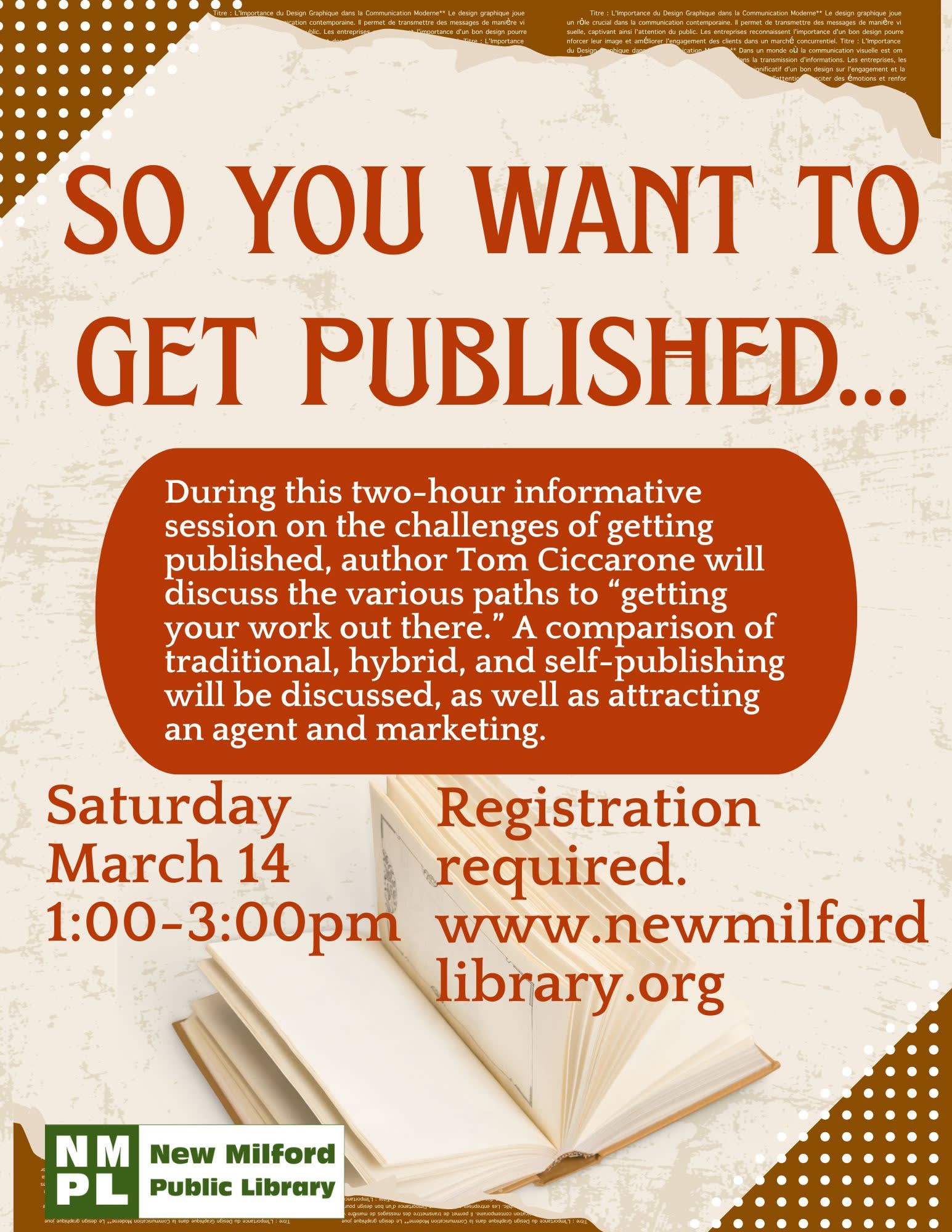 This is a two-hour informative session on the challenges of getting published. Tom Ciccarone has written and published more than a dozen books and will discuss the various paths to “getting your work out there.” A comparison of traditional, hybrid, and self-publishing will be discussed, as well as attracting an agent and marketing. This program is sponsored by the Friends of the New Milford Library.