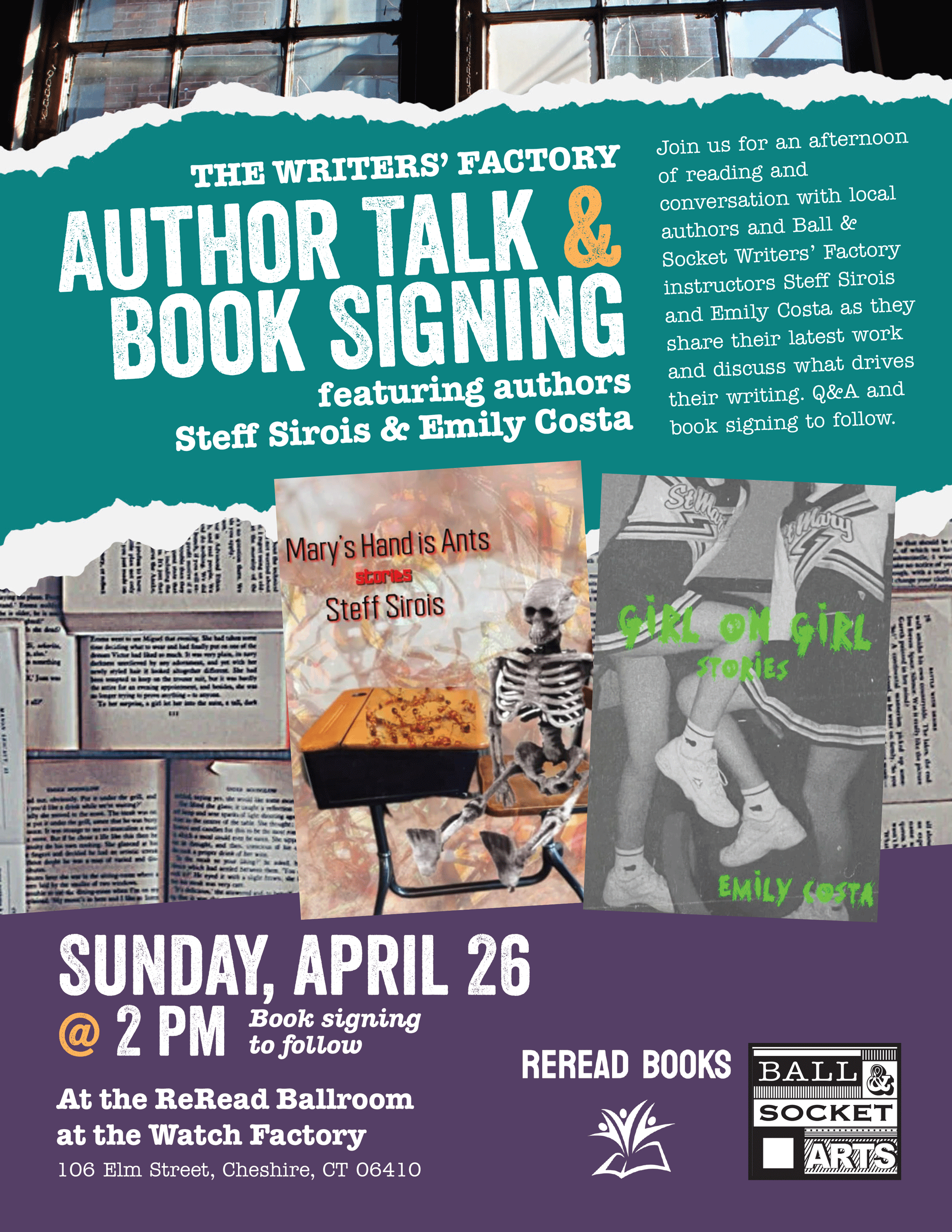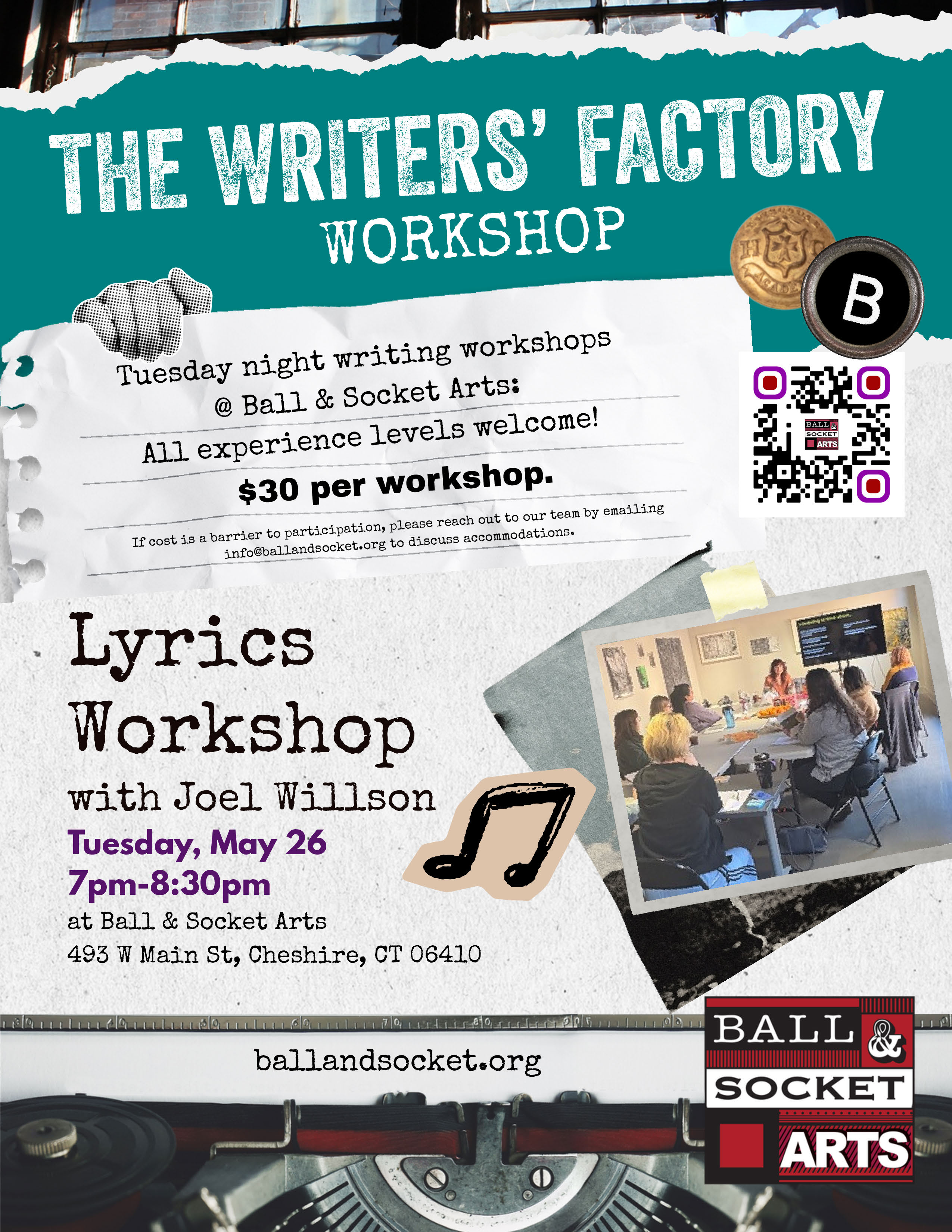 on Tuesday, May 26th from 7 to 8:30 pm @ the Workshop Gallery in Building 3 at Ball & Socket Arts.