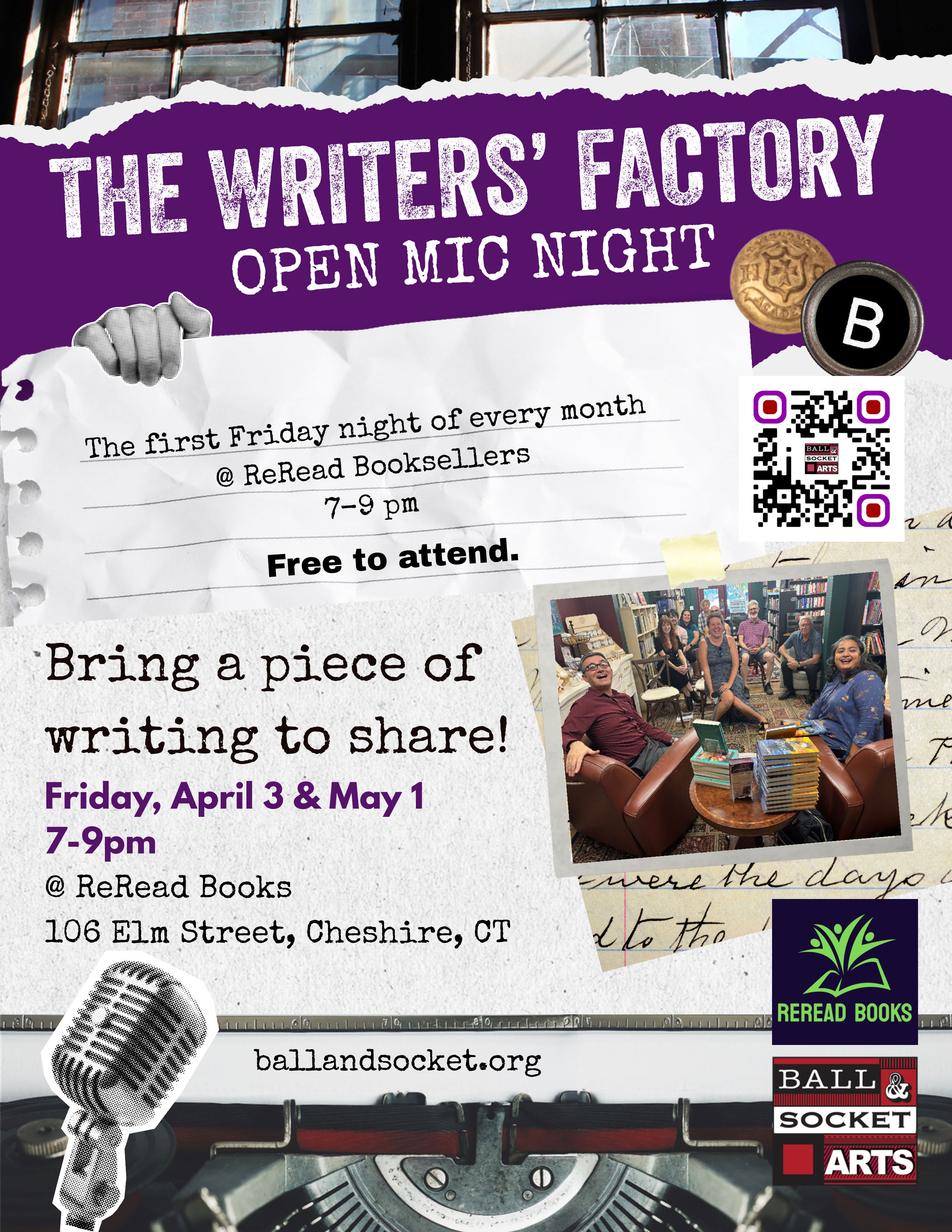 The Writers' Factory Open Mic takes place the First Friday of the month for March, April and May @ ReRead Booksellers at the Watch Factory in Cheshire, CT from 7-9 pm.