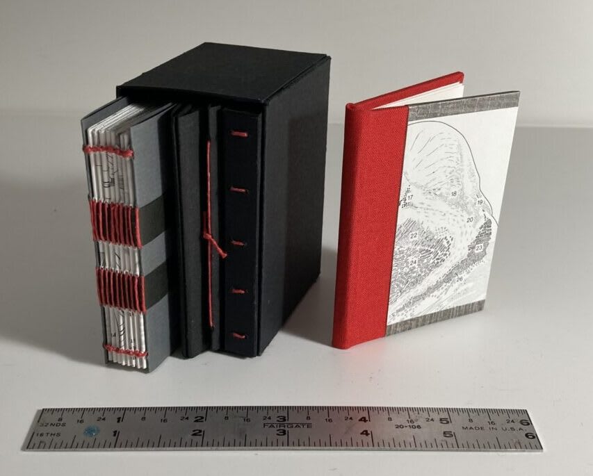 Students will make a variety of same sized books in miniature with a paper box to hold them. Bindings will include 3 soft cover pamphlet variations, a hardcover pamphlet, and a hardcover exposed sewing with pages precut from discarded books. After this class you may be inspired to make larger and more complicated books!