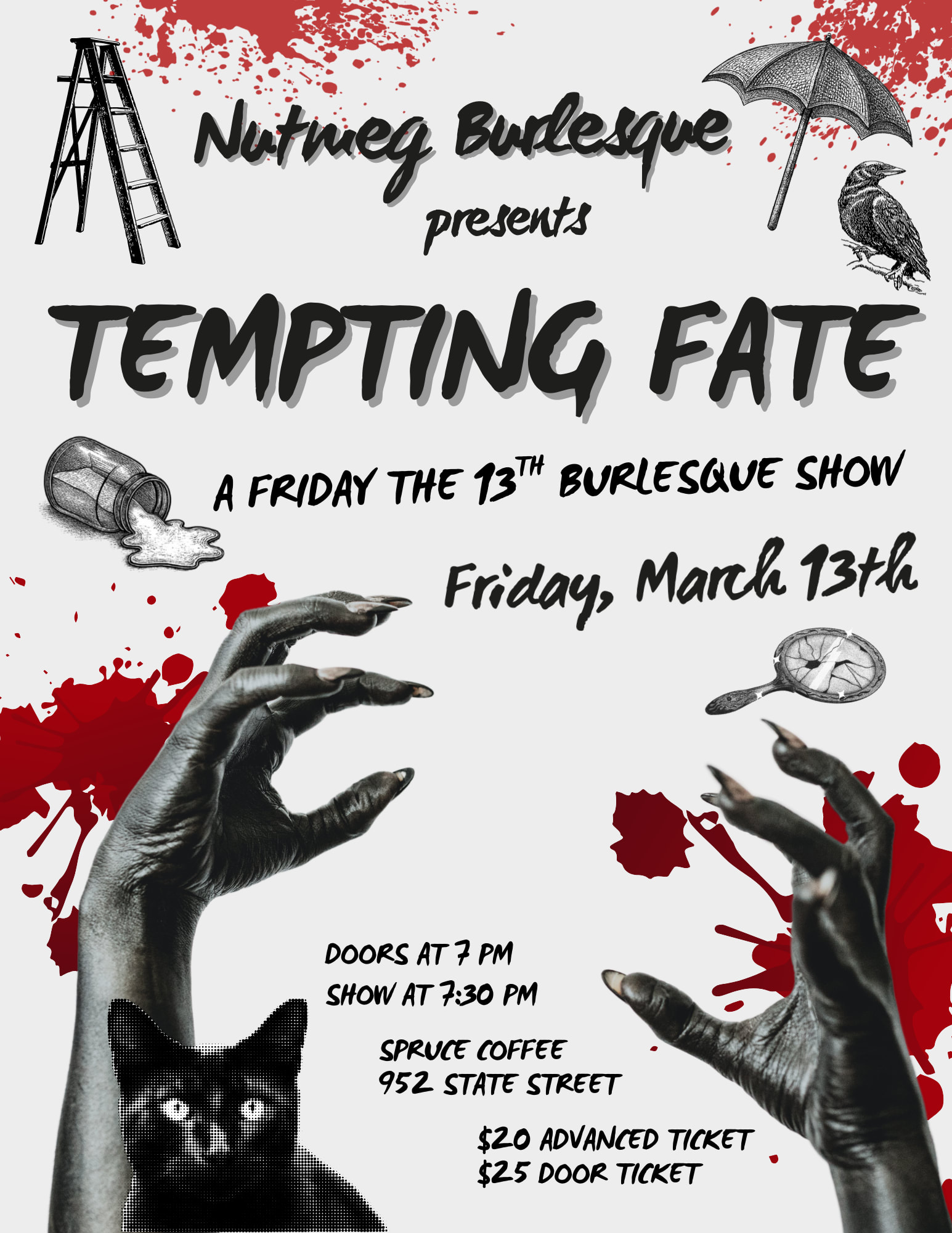 Black cats. Spilled salt. Bad luck. On Friday the 13th, Nutmeg Burlesque is leaning all the way in with TEMPTING FATE, a superstition-soaked night of sultry, sus, slightly unhinged burlesque. Come flirt with bad luck and see what happens when superstition meets striptease. Crossing fingers optional. There might even be a few dashes of good luck!!