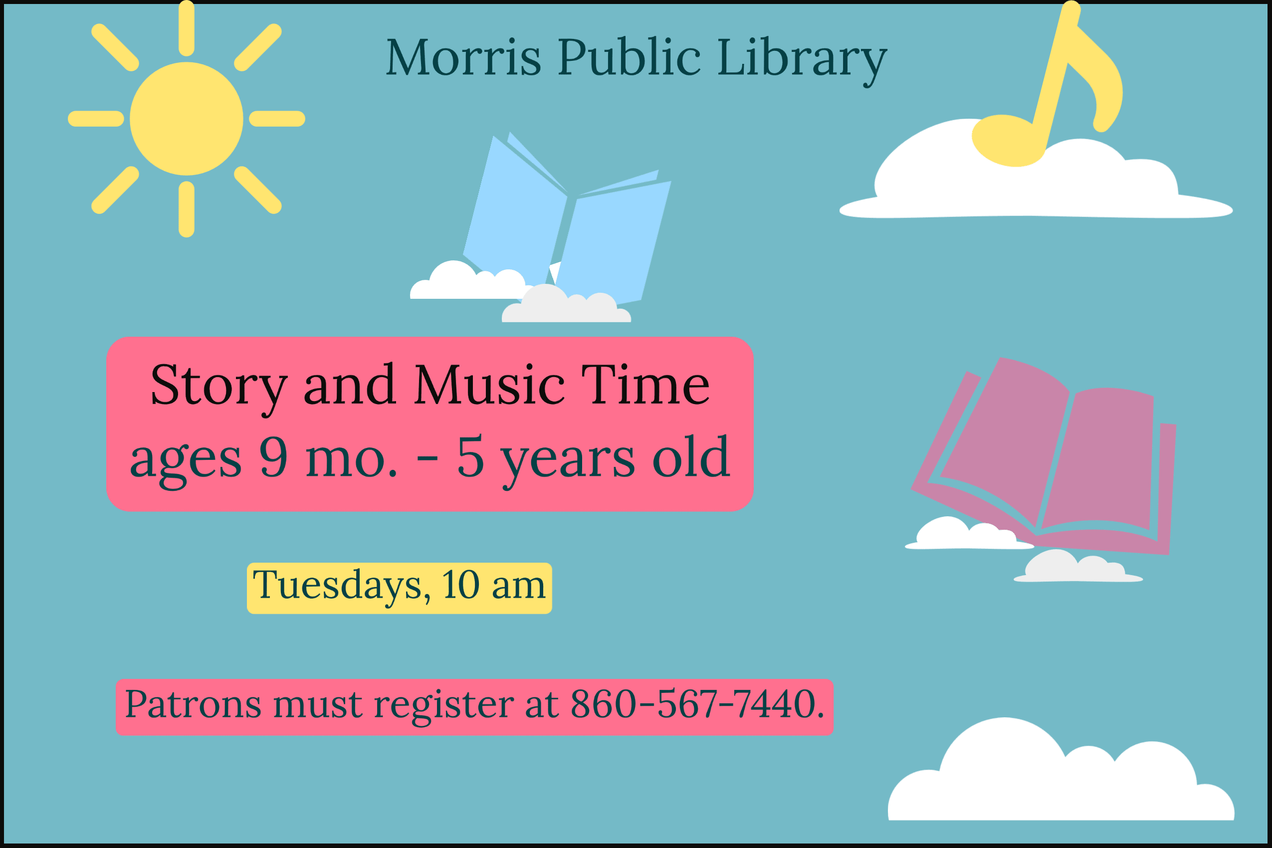 The Morris Public Library offers Story and Music Time for participants ages 9 mo. - 5 y.o every Tuesday at 10 am.